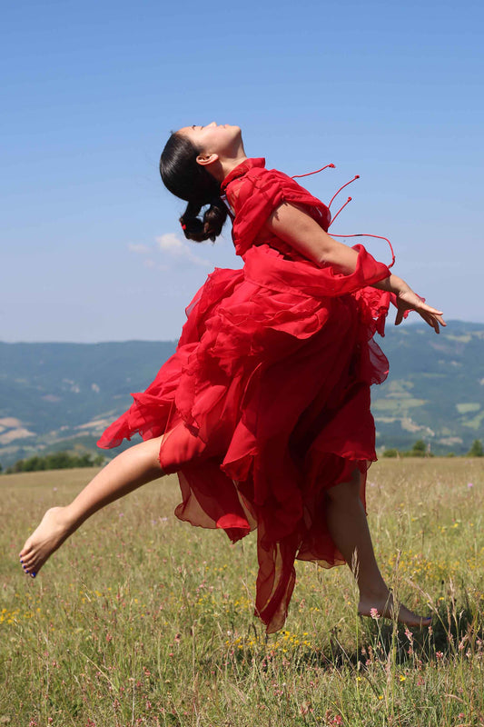 Legame - Abito Rosso in Voile con lavorazione manuale in corde.