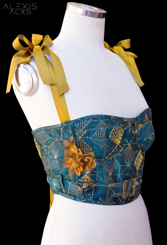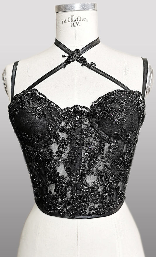 Black Crown - Corsetto nero in pizzo con ricami a rilievo e perle