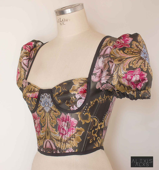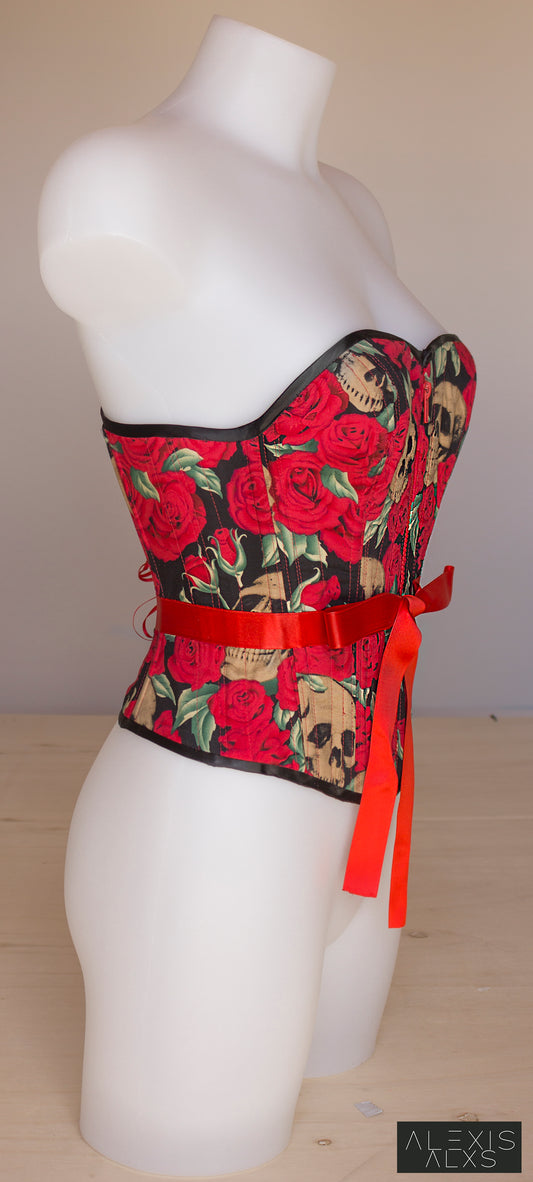 Camille- Corsetto scollo a cuore con motivi rose e teschi e fiocco in vita